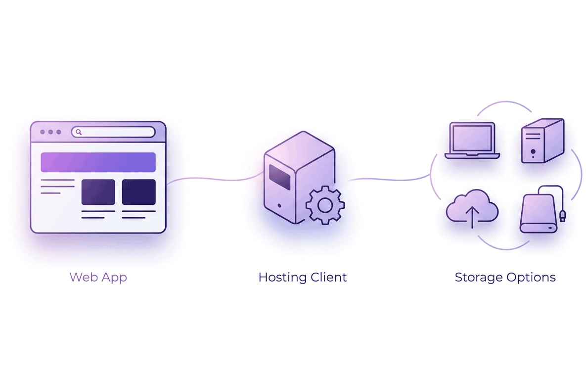A lightweight hosting client runs on your computer or server and handles storage and synchronization.